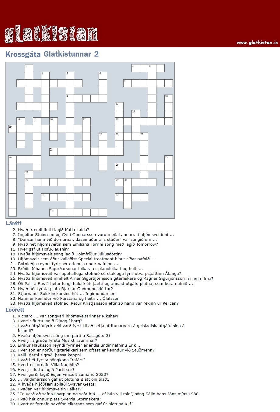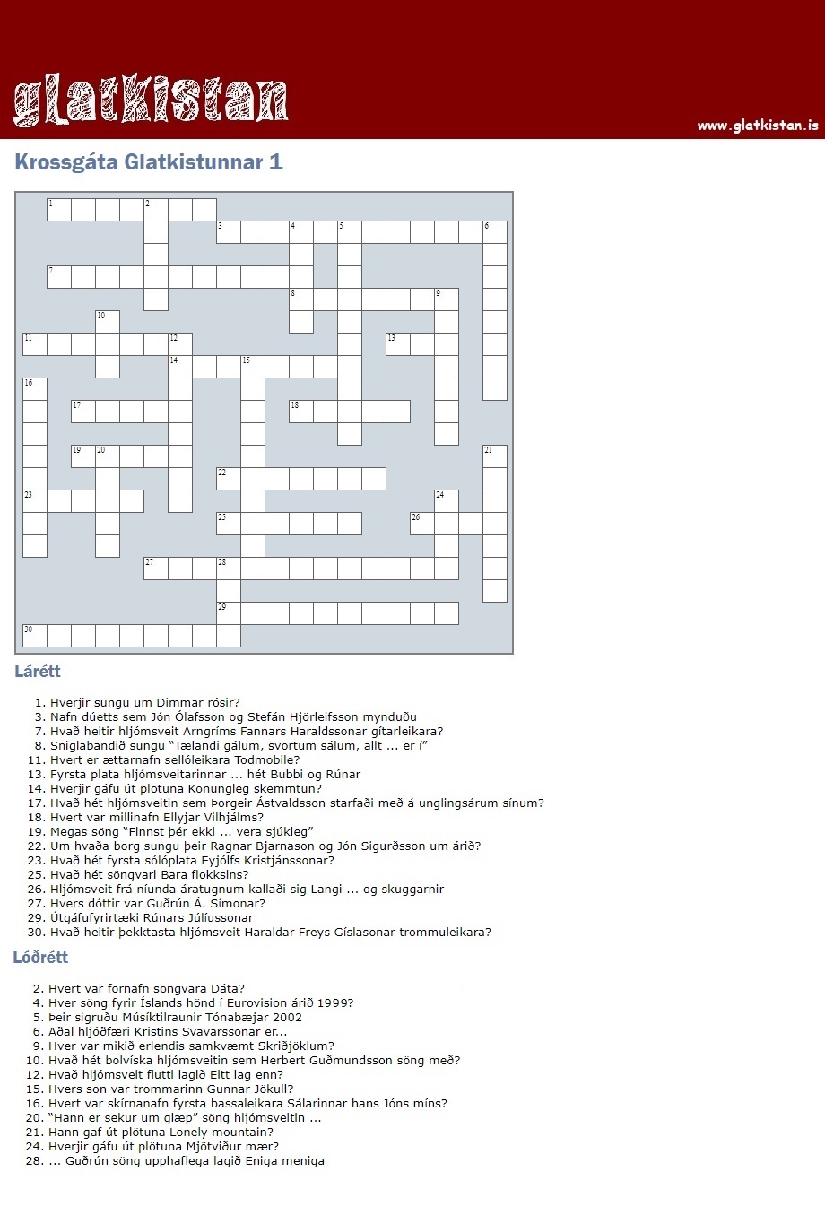 Glatkistan býður nú upp á nýja tegund afþreyingarefnis en það eru tónlistartengdar krossgátur fyrir fólk á öllum aldri. Þær munu birtast með reglubundnum hætti á vefsíðunni og er hægt að leysa þær beint á vefnum en jafnframt verða þær aðgengilegar til útprentunar.