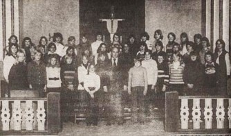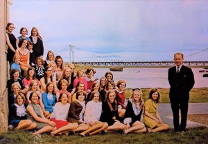 Stúlknakór Gagnfræðaskólans á Selfossi á tröppum Selfosskirkju vorið 1968